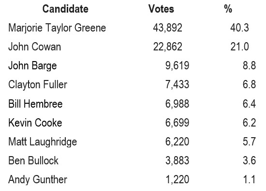 Cowan was endorsed by all the elected officials in the District, but for some reason, it was Greene who got the support of the House Freedom Fund, which donated $103,005 to her campaign. Representative Jim Jordan from Ohio contributed $4,000 to her. Most significantly, Greene donated $953,650 of her own money to her own campaign, 37% of the $2,957,509 she raised. Cowen ended up losing the runoff to Greene by 10,831 votes (57.1% to 42.9%).
