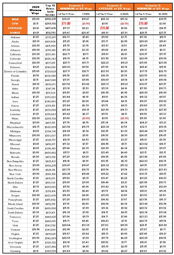 - Scenario 2: AVERAGE of $15 Wage for all States. This goal would implement the $15.00 minimum wage proposed by several members of Congress as an average of all the States. In this scenario, the minimum wages would be 6.560% of each State’s Top 1% Wage. Maine would have a minimum wage of $9.50, again, inconsequential. New Jersey would have a minimum wage of $26.32, much better than $11.00. 17 States would have a minimum wage below $15.00 and 34 States would have a minimum wage above $15.00, depending on their economies.