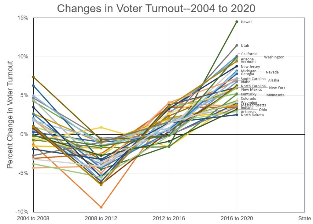 Within the increasing long-term trend in voter turnout are changes attributable to the nature of the political contest for President. Turnout rose to 62% in 2008 for the election of Barack Obama as President. But, turnout dipped to 58% for his second election. The Trump-Clinton contest drew a 60% turnout. After four years of Donald Trump, 68% of the electorate turned out to elect Joe Biden. This pattern is reflected in the turnout statistics for nearly every State, as shown in the following graph of changes in turnout rates.