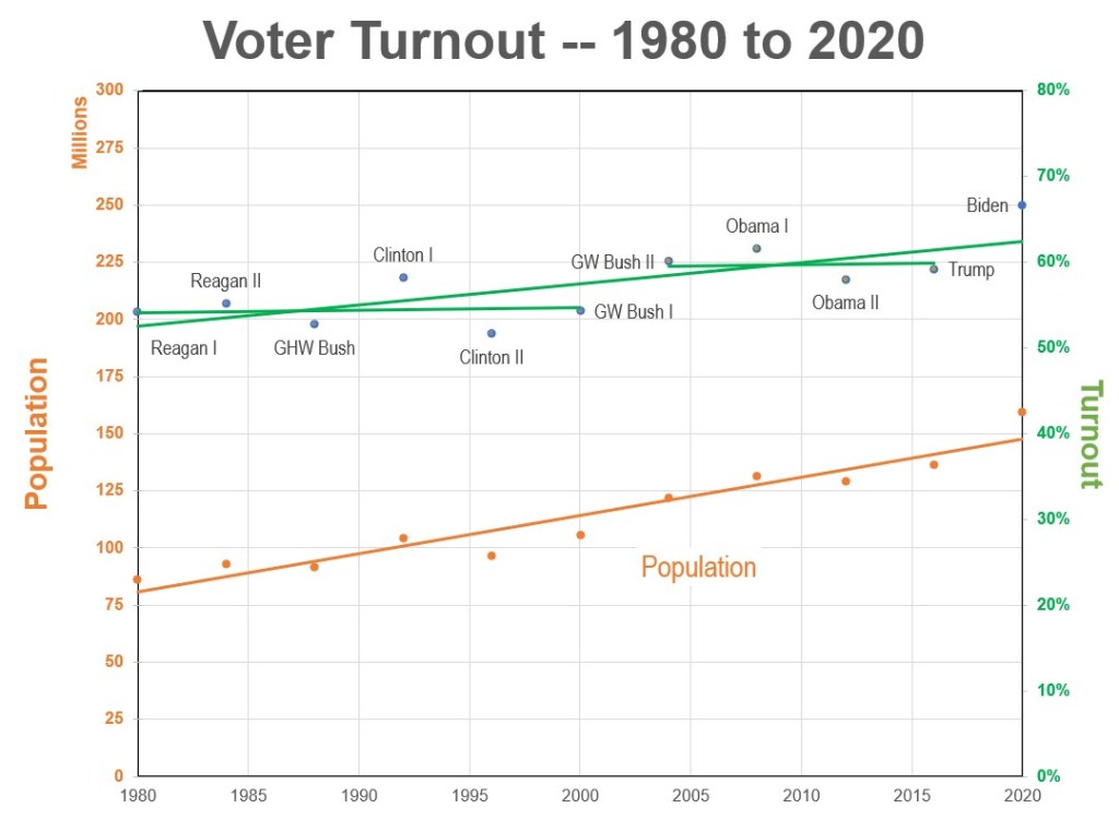 Turnout is simply the percentage of eligible voters who cast a ballot on election day. Overall turnout in the popular vote has increased by about 10% from 1980 to 2020, as shown in the following graph. However, the change wasn’t strictly uniform. It seems that there was an upward shift after the 2000 election. Perhaps all the news about butterfly ballots and hanging chads in Florida made people aware that our electoral system was in a crisis. Certainly, 2001 brought home the message that elections have consequences.