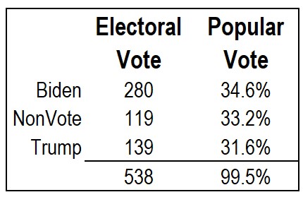 So who won? Biden. With or without the non-voters, he won both the popular vote and the electoral vote. That’s a nice change from the elections of 2000 and 2016. And Trump? He came in second in the electoral vote and THIRD in the popular vote. Yes there were more people who didn’t vote than people who voted for Trump.