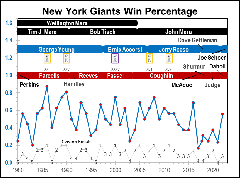 New York Giants: Ownership, Management, Coaching, and Record. 1980 to 2022.
