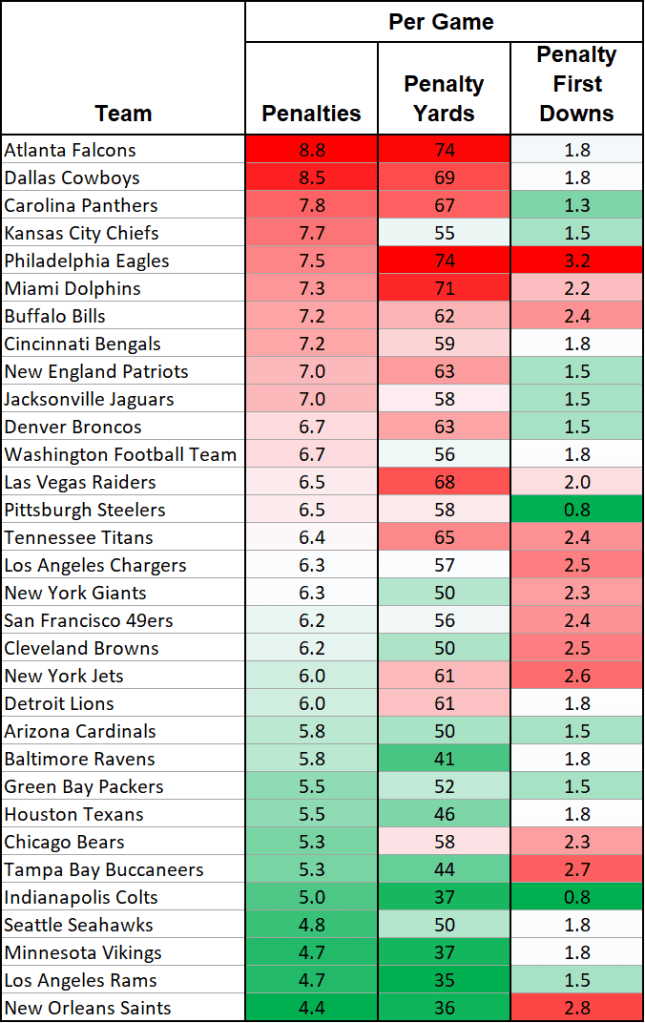 So far in the 2021 season, the Atlanta Falcons have committed the most penalties. The Philadelphia Eagles have been penalized for the most yardage and have given up the most first downs by penalty. In contrast, the New Orleans Saints have committed the fewest penalties for the fewest yards.