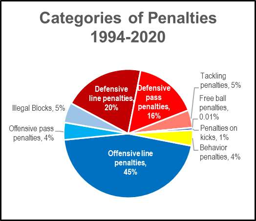 This pie chart shows the prevalence of the penalty categories by their occurrence from 1994 to 2020 (by either counts or yards, the percentages are about the same). About 54% percent of penalties are committed mainly on the offense and 41% are committed mainly on the defense.