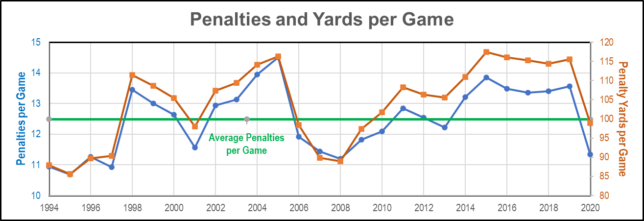 Since 1974, 84,987 penalties have been called for 707,800 yards in 6,912 NFL games. That’s about 12 penalties for 102 yards per two-team matchup, 8 yards per penalty. Those statistics reflect a mind boggling number of different players, coaches, referees, and rule changes over 27 seasons. The number of penalties and penalty yards per game from 1994 through 2020 (when there were 16 games per season) are shown in the following graph. There have been increases and decreases in penalties over those years but no significant trend.