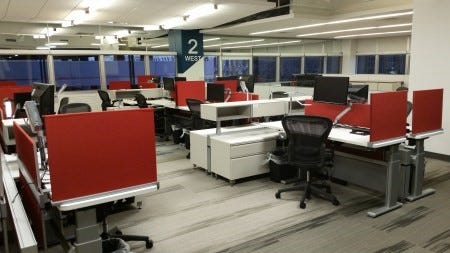 All workstations were not created equal. Some were located in areas considered to be more desirable, like near windows or pantries. Some were in areas considered to be more isolated and less noisy. Some workstations had larger or multiple monitors.