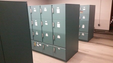 There were also personal challenges. Wanderworkers couldn’t have some of the personal items they had become accustomed to because they had to be removed from workstations every day. That included not just pictures of loved ones, but also coffee mugs, seat cushions, fans, heaters, footstools, air cleaners, and other things that made individuals more comfortable working in the office. They also had to carry around their own office supplies — pens, paperclips, staplers, scissors, tape, stationary, reference books — or borrow them from a central repository. Because employees couldn’t leave items at workstations, they had to have their own personal storage. Each employee was assigned an 18-inch cube in a central “locker room.” The lockers were also used for overnight storage of employees’ computer hardware. The self-setting electronic locks sounded great in the brochure, but after a few weeks of malfunctions, everybody just used the default combinations taped to the outside of the cubes.